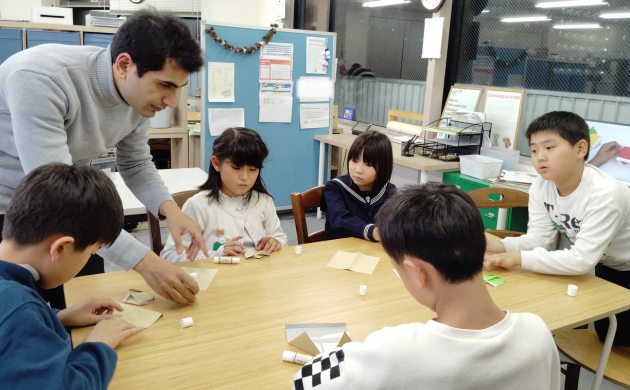 アートの時間には、クリスマスにちなんだクラフト制作も行いました。写真は、キラキラの折り紙を使ってクリスマスベルのデコレーションを作っている様子です。クラフトの時間ももちろん英語で進められ、楽しい活動を通して自然に英語を使うことができます。生徒の皆さんが作ったベルで、教室がとても華やかになりました!