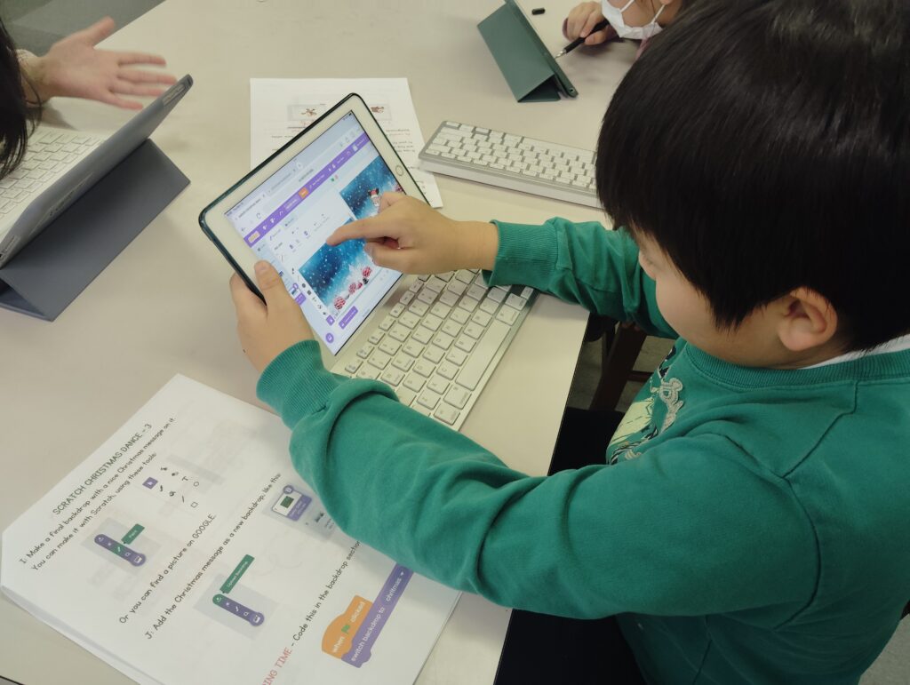 こちらは、英語を使ってプログラミングに取り組み、クリスマスにちなんだ簡単なアニメーションを作っている様子です。
