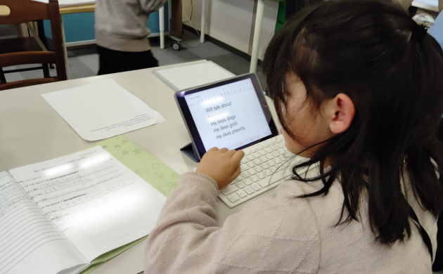 クリスマスショーの冒頭では、イントロダクションとしてクラスメートを英語で紹介します。自信を持って発表できるように、まずは英語で原稿作りからスタートしました。原稿にまとめることで発表内容が整理でき、ライティングの練習にもなります。
