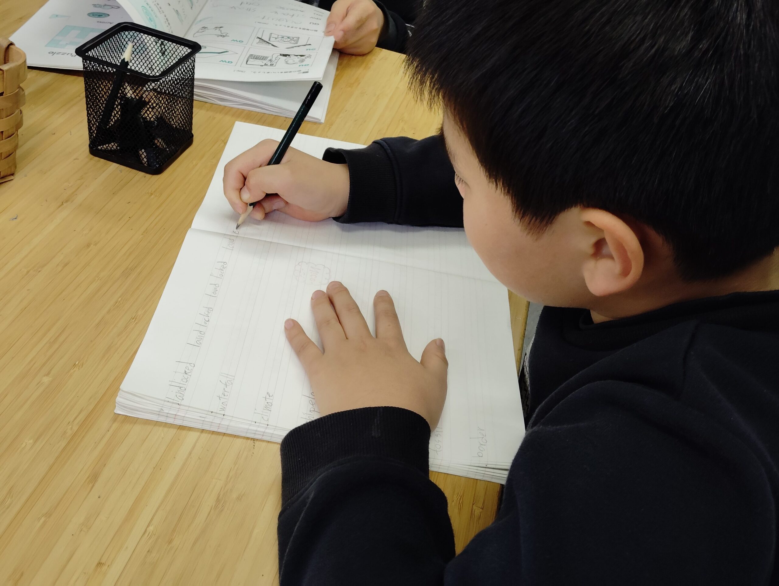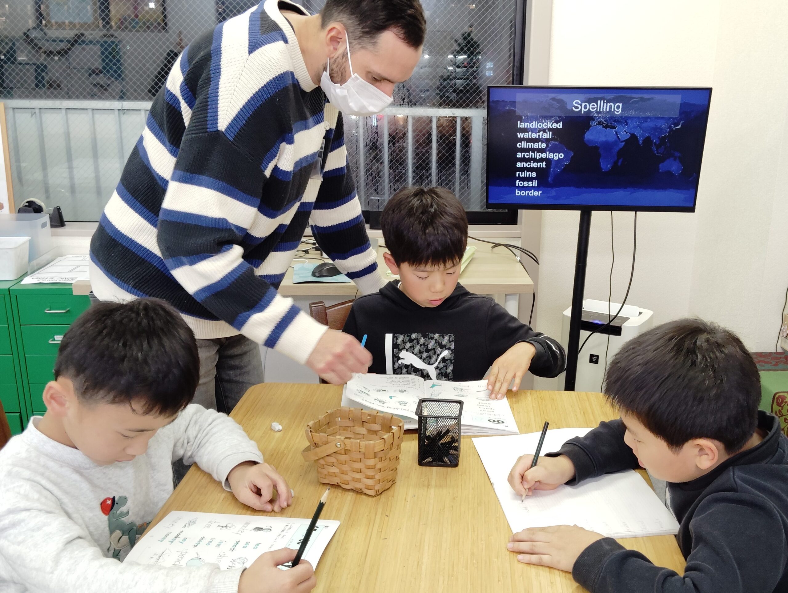 こちらはフォニックスやスペリングの練習をしている様子です。11月のテーマは「大陸」でしたので、各科目の学習とあわせて waterfall(滝) や border(国境) など関連する語彙の意味を確認し、正しく書けるよう練習しました。