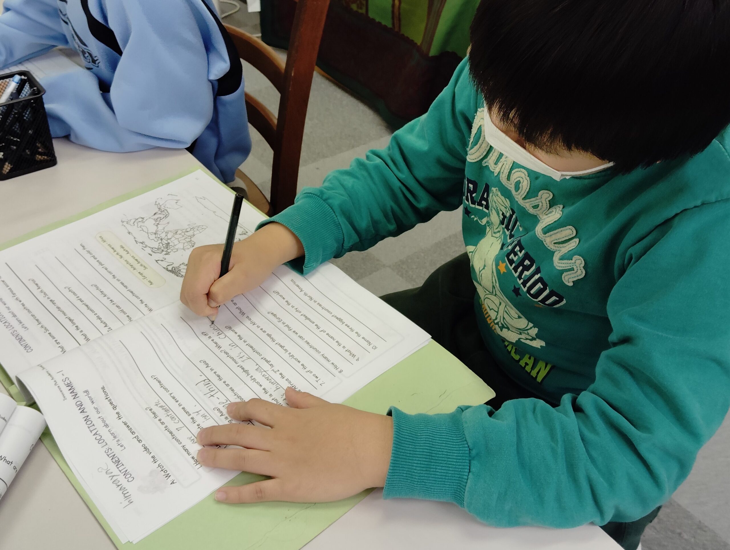 ワークシートで学んだことを振り返りながらまとめることで、大陸についての理解がさらに深まりました。Asia(アジア)やAntarctica(南極大陸)など、関連する英単語も学んでいただけます。