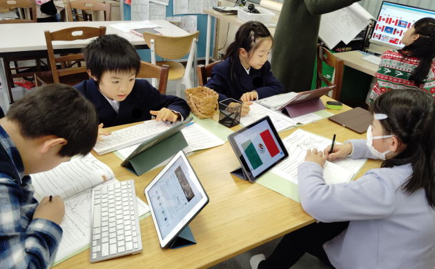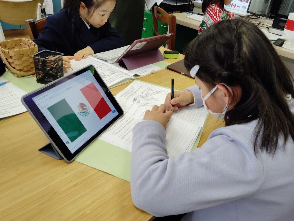 また、タブレットを使い、各都市の国旗を調べました。見つけた国旗を丁寧に描いて、スペルの確認にも挑戦しました。