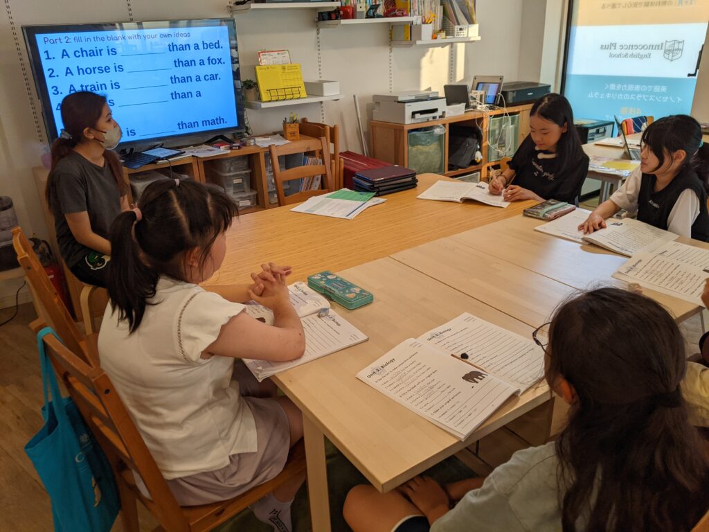 今回は、比較級を学習しています。皆さん、予習をしているので、文法の特徴について講師から聞かれ、” ~er than ~ ” の形について答えることができていました。